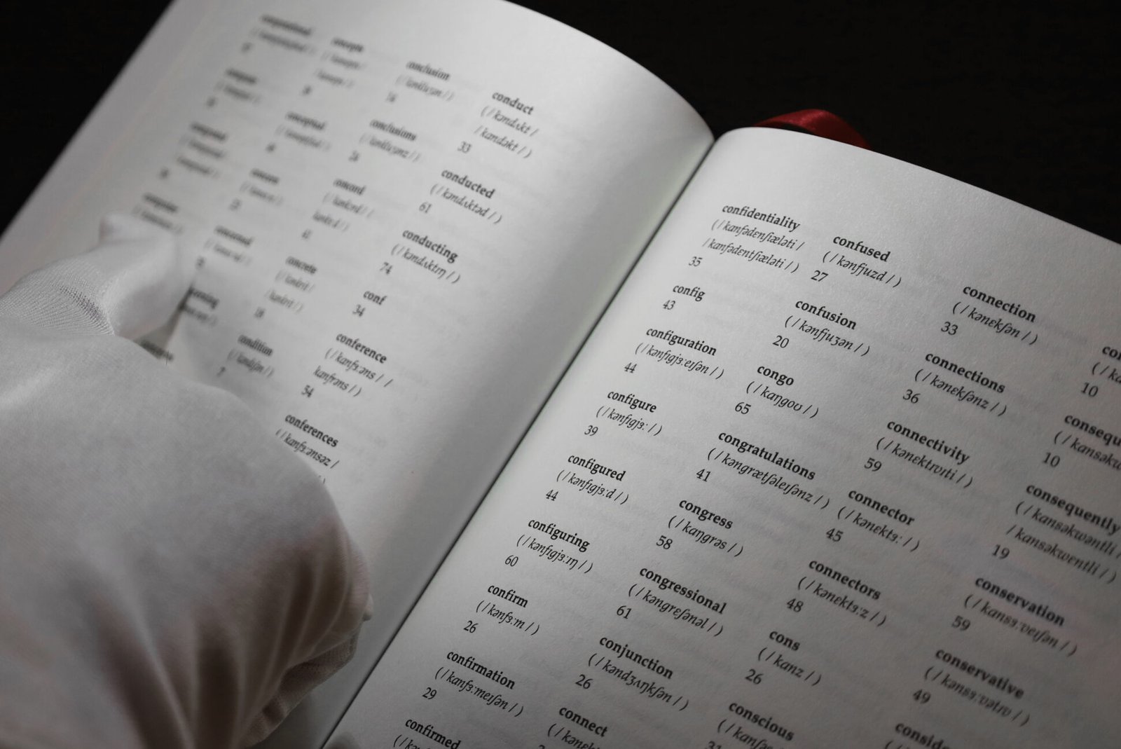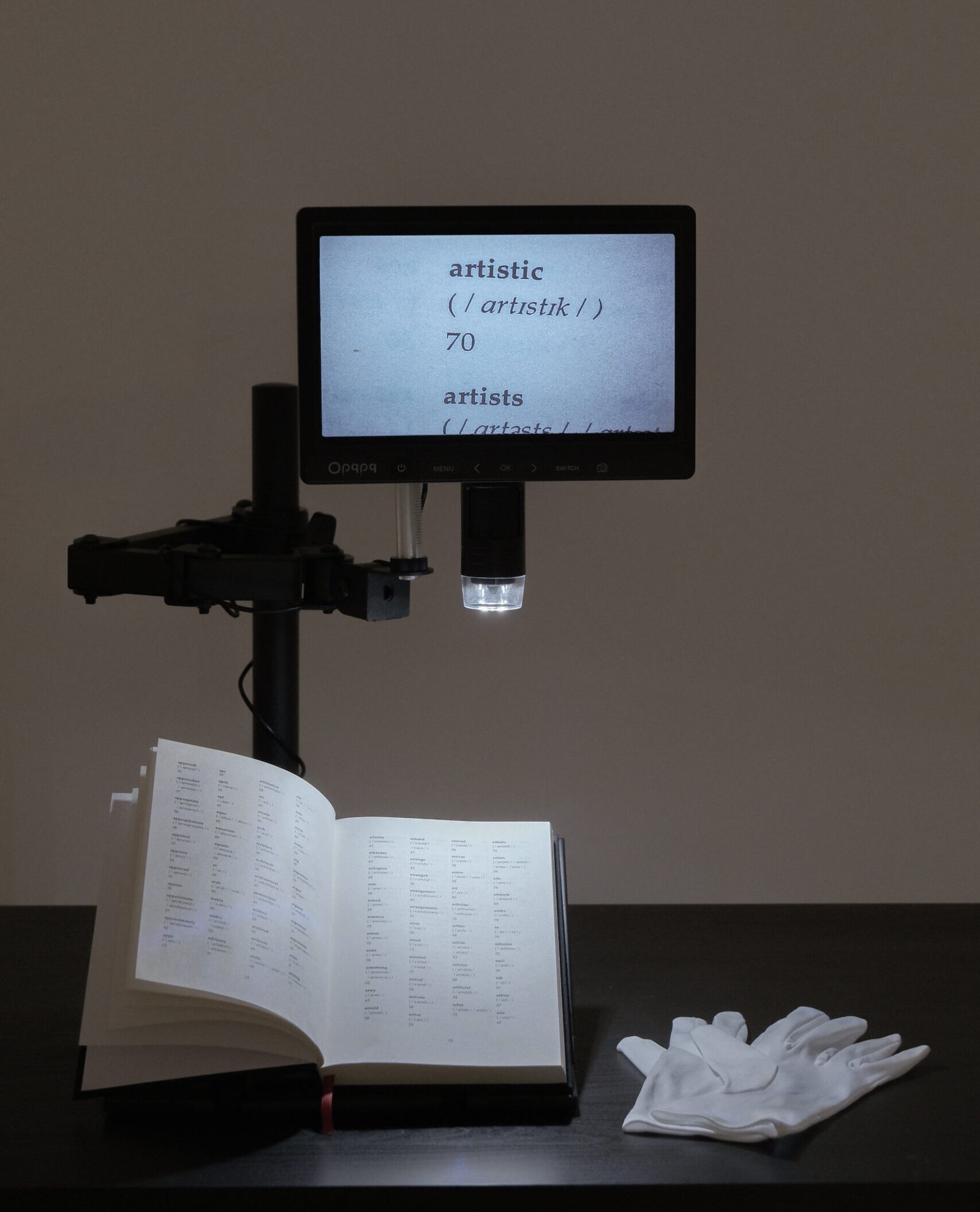 Printed publication (dictionary), digital microscope, white gloves, table and stool, custom machine learning model